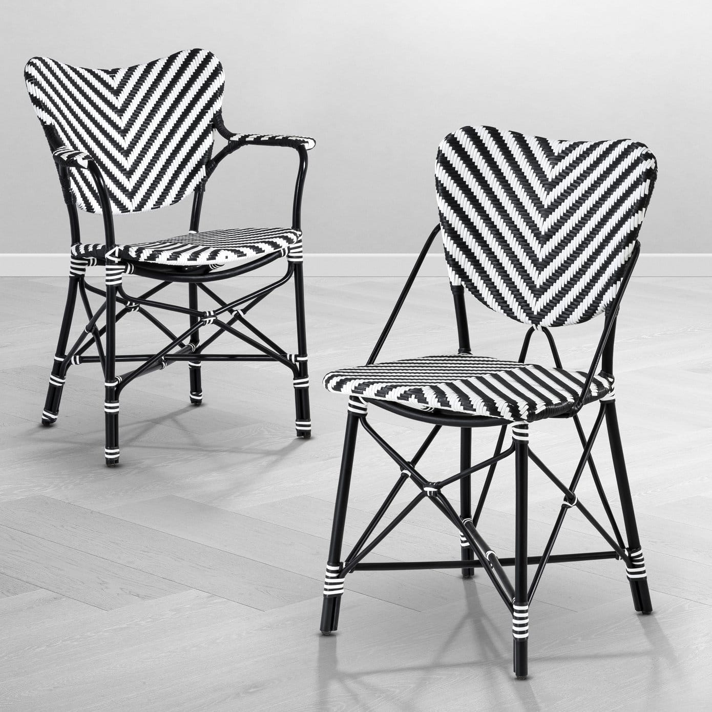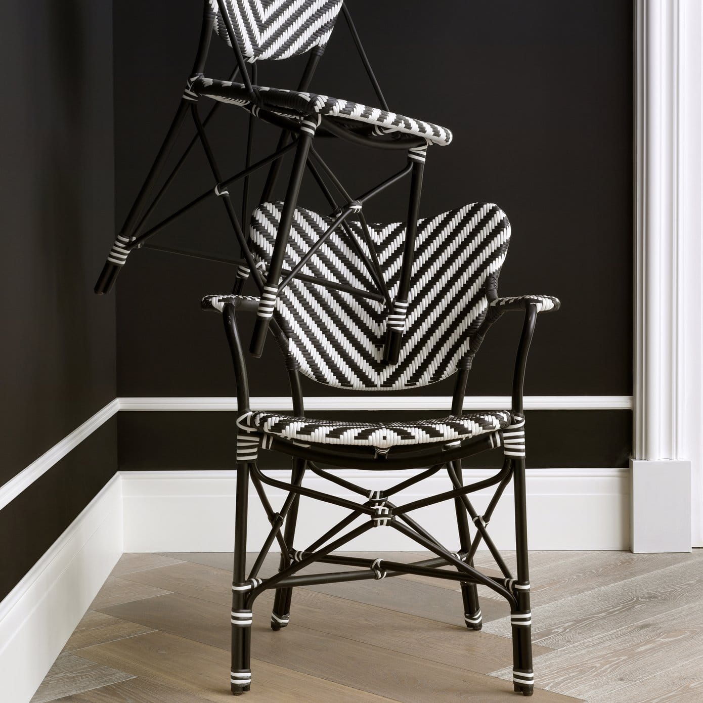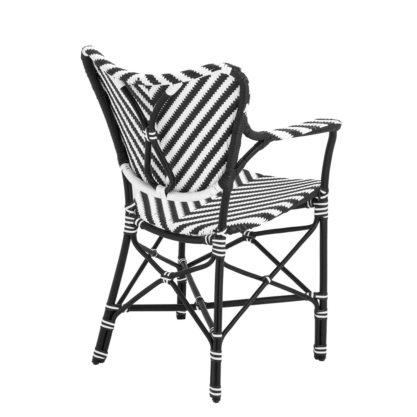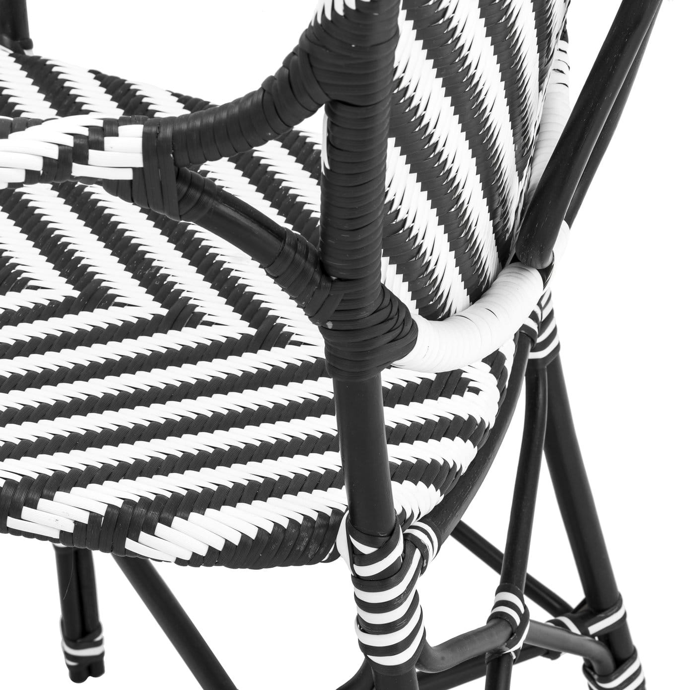 Spice up your dining room or lounge with the monochrome rattan Colony Chair with arms. Drawing inspiration from vintage colonial dining chairs, this hand woven lightweight furniture piece with black and white chevron aesthetic is easy to stack.