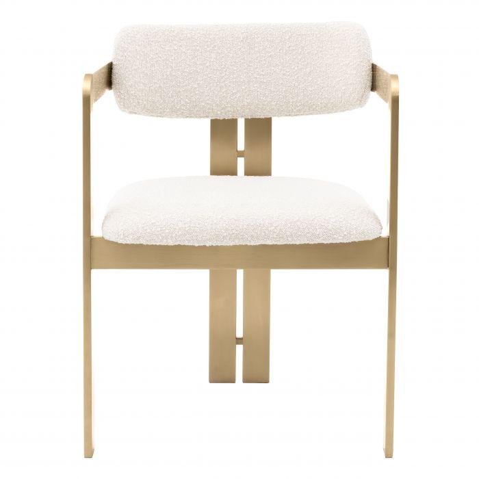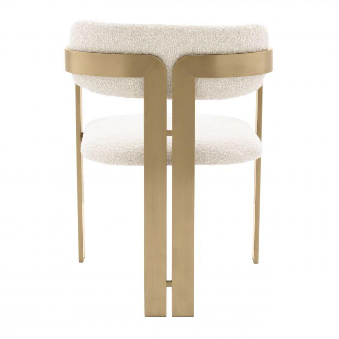 Bring a modern touch to your dining arrangement with the Donato Dining Chair. Bound to be a talking point for guests, this stylish accent chair offers a unique design with two armrests that merge into the front two legs and two rear legs that support the rounded backrest. The frame features a brushed brass finish and is upholstered in our bouclé cream fabric.