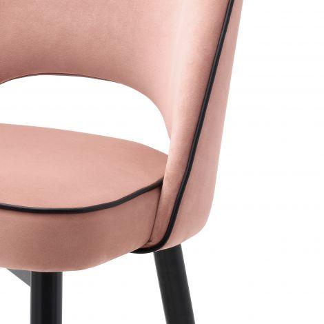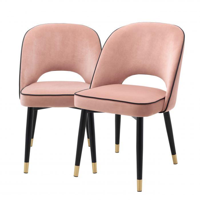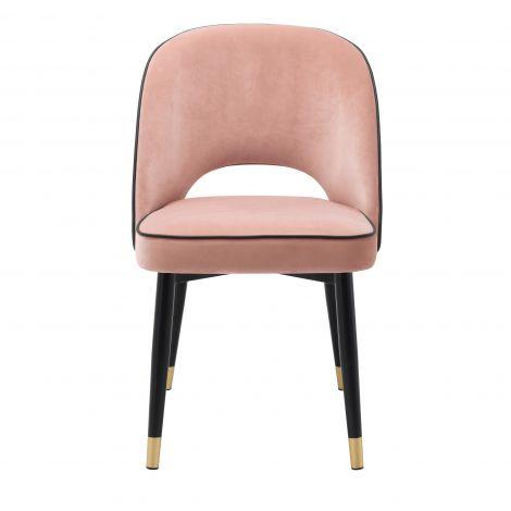 Stwórz zachwycającą jadalnię z krzesłem Eichholtz Cliff w różowym kolorze welwetowej tkaniny Savona. Solidna rama z czarnymi zwężanymi nogami i złotymi nasadkami pewnie trzyma plecy nawet bez podłokietników. Dostępne również w formie hokerów.