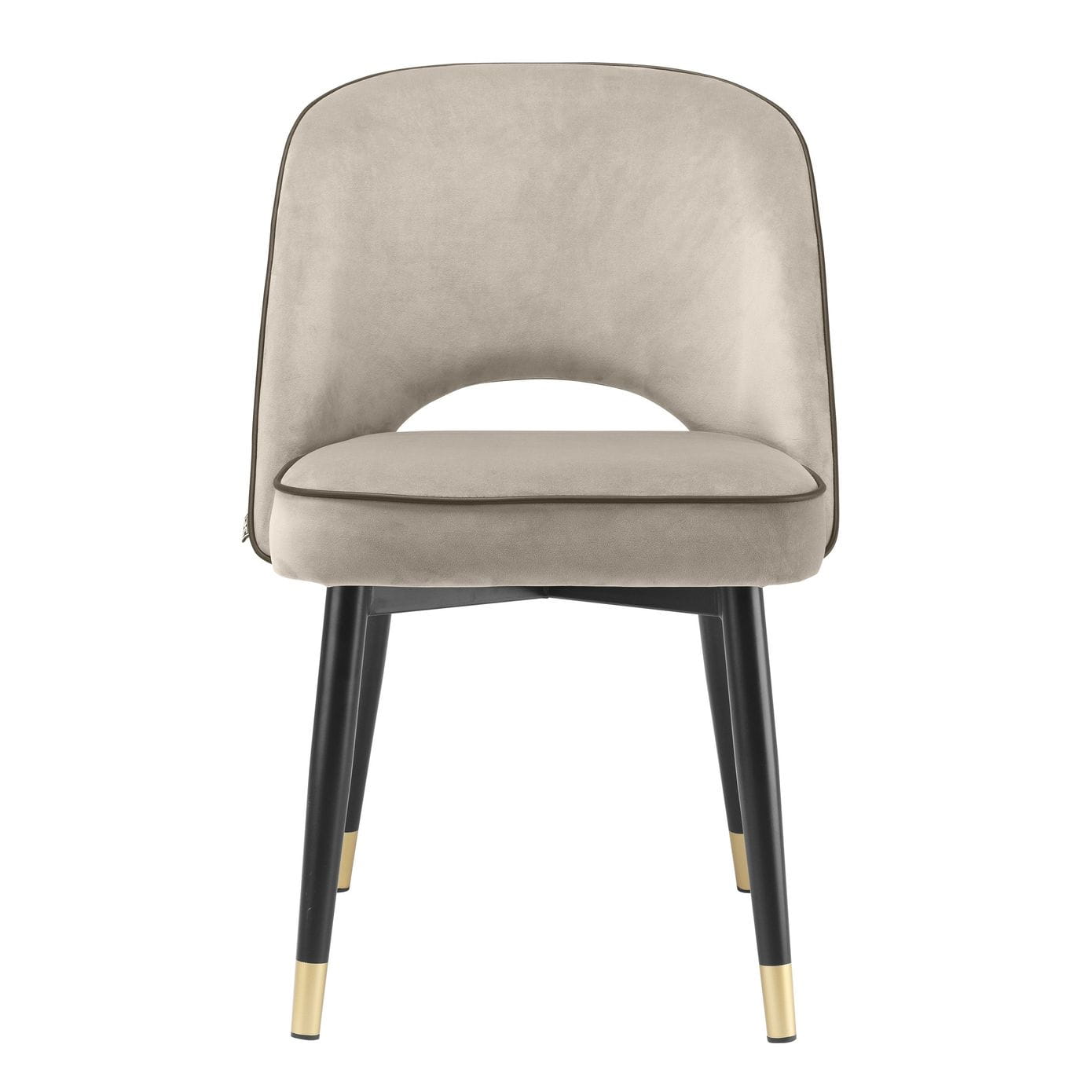 Stwórz zachwycającą jadalnię z krzesłem Eichholtz Cliff w beżowym kolorze welwetowej tkaniny Savona. Solidna rama z czarnymi zwężanymi nogami i złotymi nasadkami pewnie trzyma plecy nawet bez podłokietników. Dostępne również w formie hokerów.