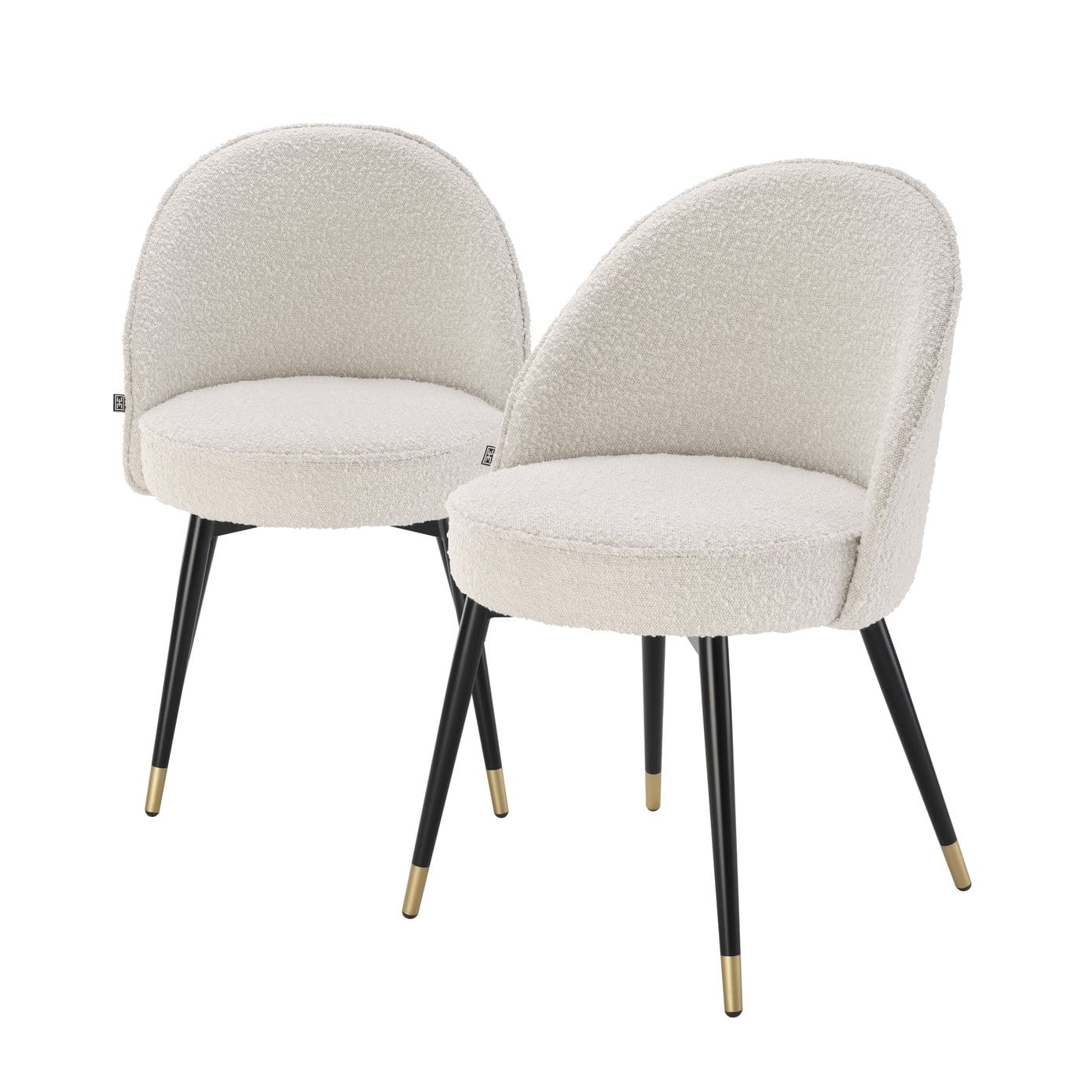 Add Mid-Century Modern appeal to your dining room or kitchen with this stylish set of 2 Cooper dining chairs. Elegantly shaped and designed for everyday living, each chair is characterised by a seating and backrest in cream-coloured bouclé, and tapered black legs with brass caps.